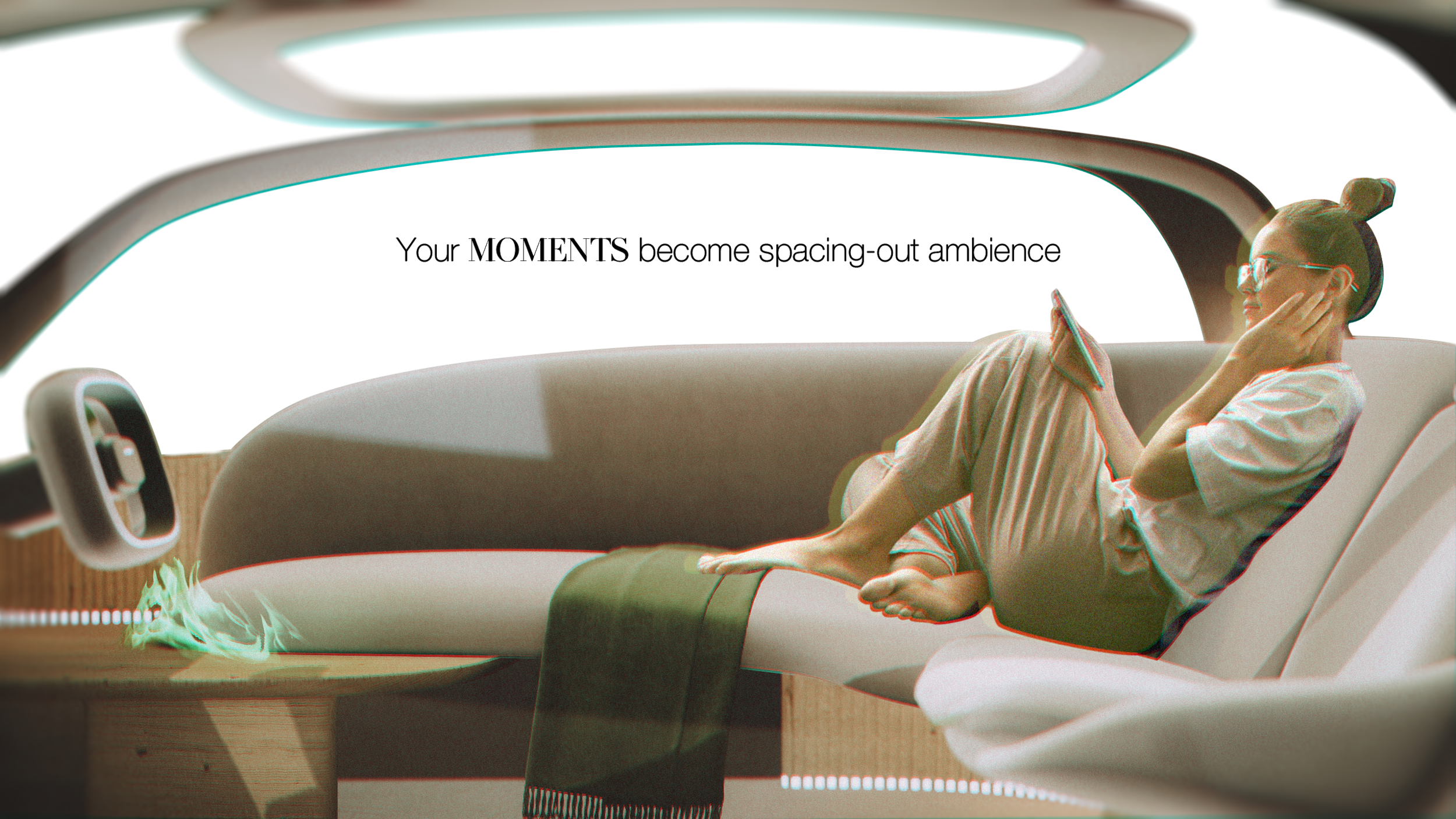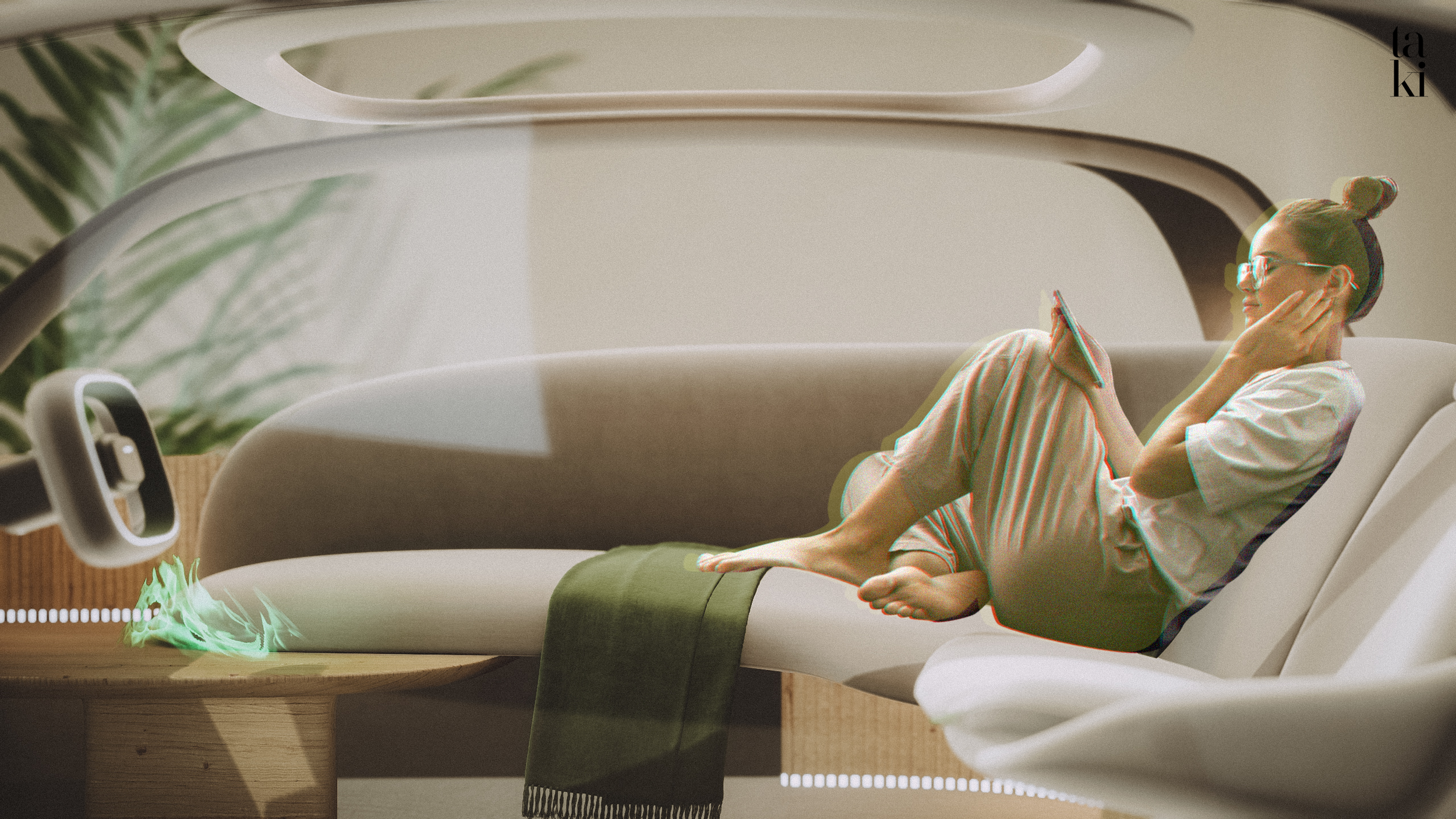 TAKI is a concept that provides quality recharge for resilience. To get resilient, the user may enjoy “Quality Spacing-Out Moment” by staring at a vapor fire. Also, TAKI is the name of vapor fire - the center piece in this mobility. Circularly reusing water exhaust from Hydrogen Fuel Cell Vehicle - Turning that water exhaust into vapor which looks exactly like a bonfire, user can enjoy bonfire ambience while driving. Additional AR features are included too, providing much more personalized spacing out experience curated from user’s memories.